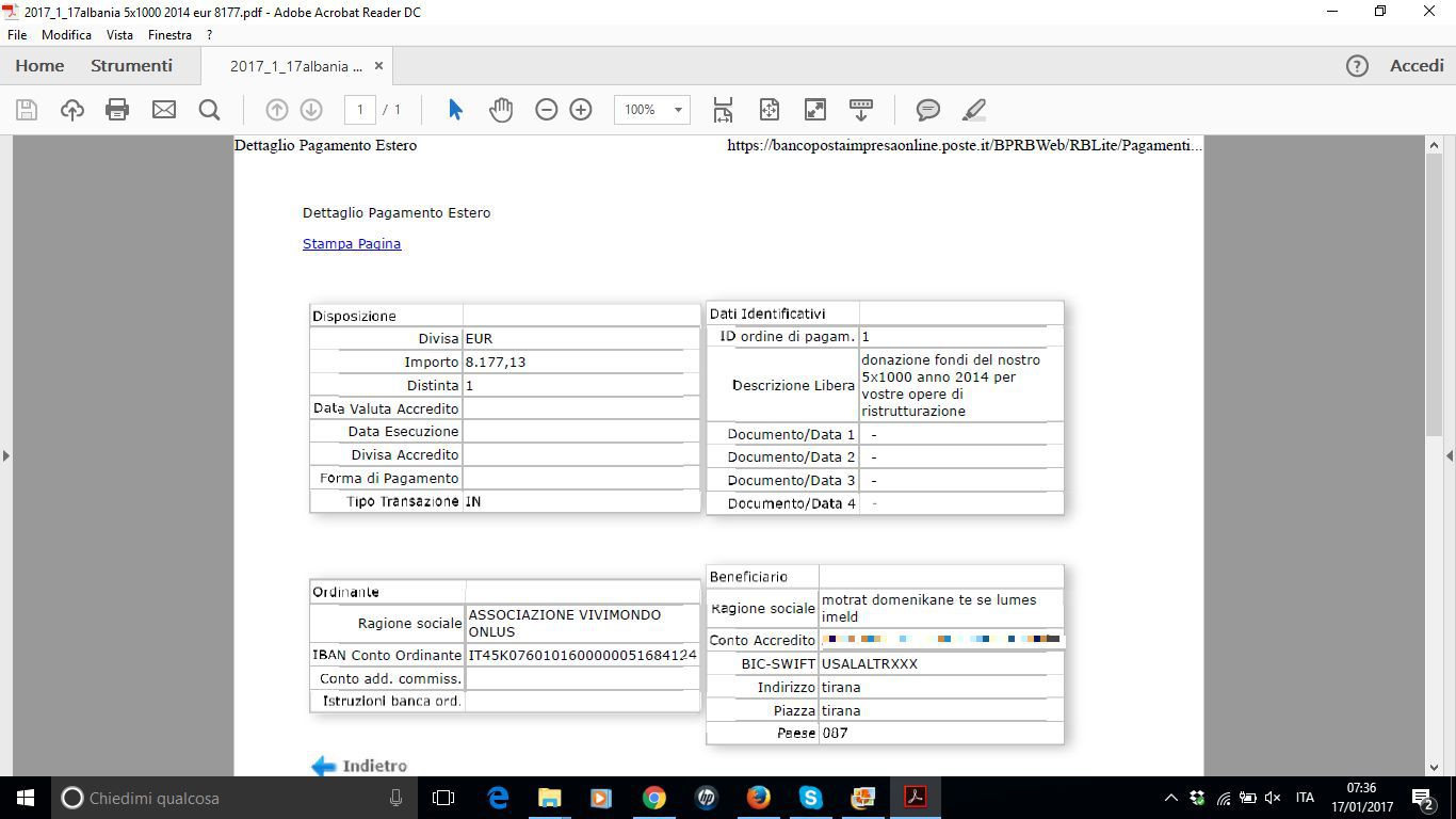 Informiamo tutti i nostri amici e sostenitori che in data 17 gennaio 2017 abbiamo provveduto a inviare a destinazione l'ultima tranche di fondi incassati dal canale del "5x1000", precisamente quelli relativi all'anno di imposta 2014, pari ad Euro 8.177,13, accreditatici in novembre 2016. Eh si, l'Agenzia delle Entrate è molto precisa: ci accredita la quota del 5x1000 dell'Irpef di chi ha scelto "Vivimondo" esatta fino al centesimo.... E siccome anche noi siamo altrettanto precisi, l'abbiamo bonificata tutta, fino all'ultimo centesimo, alle Suore Imeldine di Elbasan (Albania).
